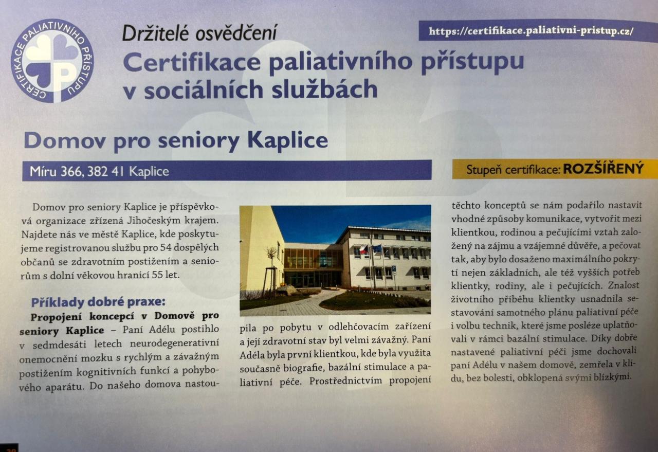 V odborném časopise "Sociální služby" vyšel článek o rozšíření certifikace paliativního přístupu v našem Domově pro seniory Kaplice.