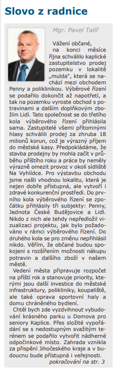 Kaplický zpravodaj 11/2019 - Slovo z radnice