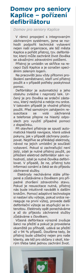 03/2022 - Kaplický /Velešínský zpravodaj - Domov pro seniory Kaplice - pořízení defibrilátoru